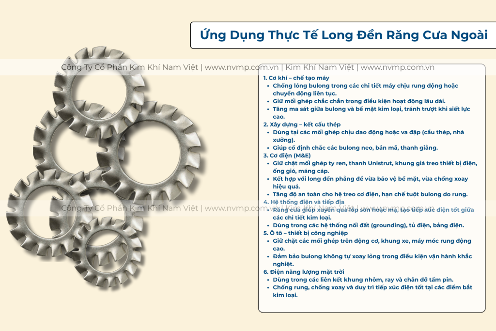 4. Kết hợp: thường đặt trực tiếp dưới đai ốc hoặc đầu bulong. Nếu cần bảo vệ lớp sơn, có thể cân nhắc phương án khác (ví dụ dùng long đền phẳng hoặc phủ bổ sung), vì răng cưa sẽ làm xước lớp phủ.